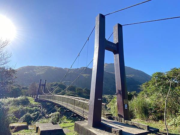 「菁山吊橋」是陽明山國家公園園區內唯一的吊橋,紅褐色的橋柱、黑色的鋼索與褐色原木的橋板是它的特色,獨立於青山環繞之間更顯其耀眼,也是婚紗攝影的首選勝地,吊橋長約50公尺,走在上面時還可欣賞冷水坑溪的溪谷景致,主食還沒有享用就被這二道超級甜點迷倒,這條步道是不是讓人走上千遍也不厭倦呢。